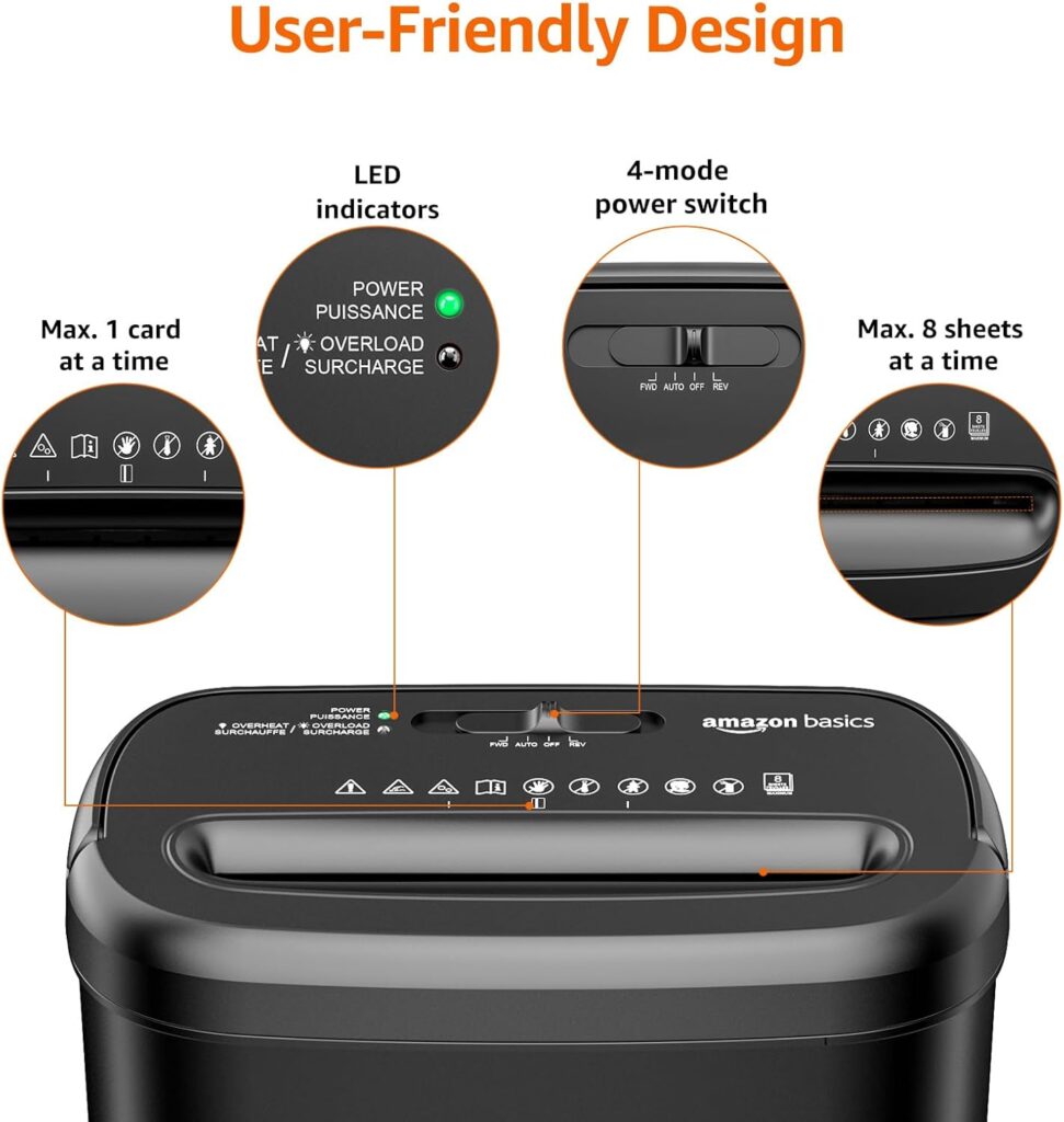 The Amazon Basics 8-Sheet Cross-Cut Paper and Credit Card Shredder offers an array of features designed to meet the needs of home and small office users. Below is an in-depth exploration of its standout features and the benefits they bring: